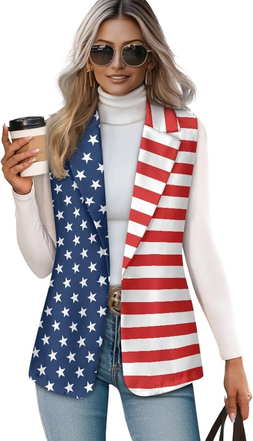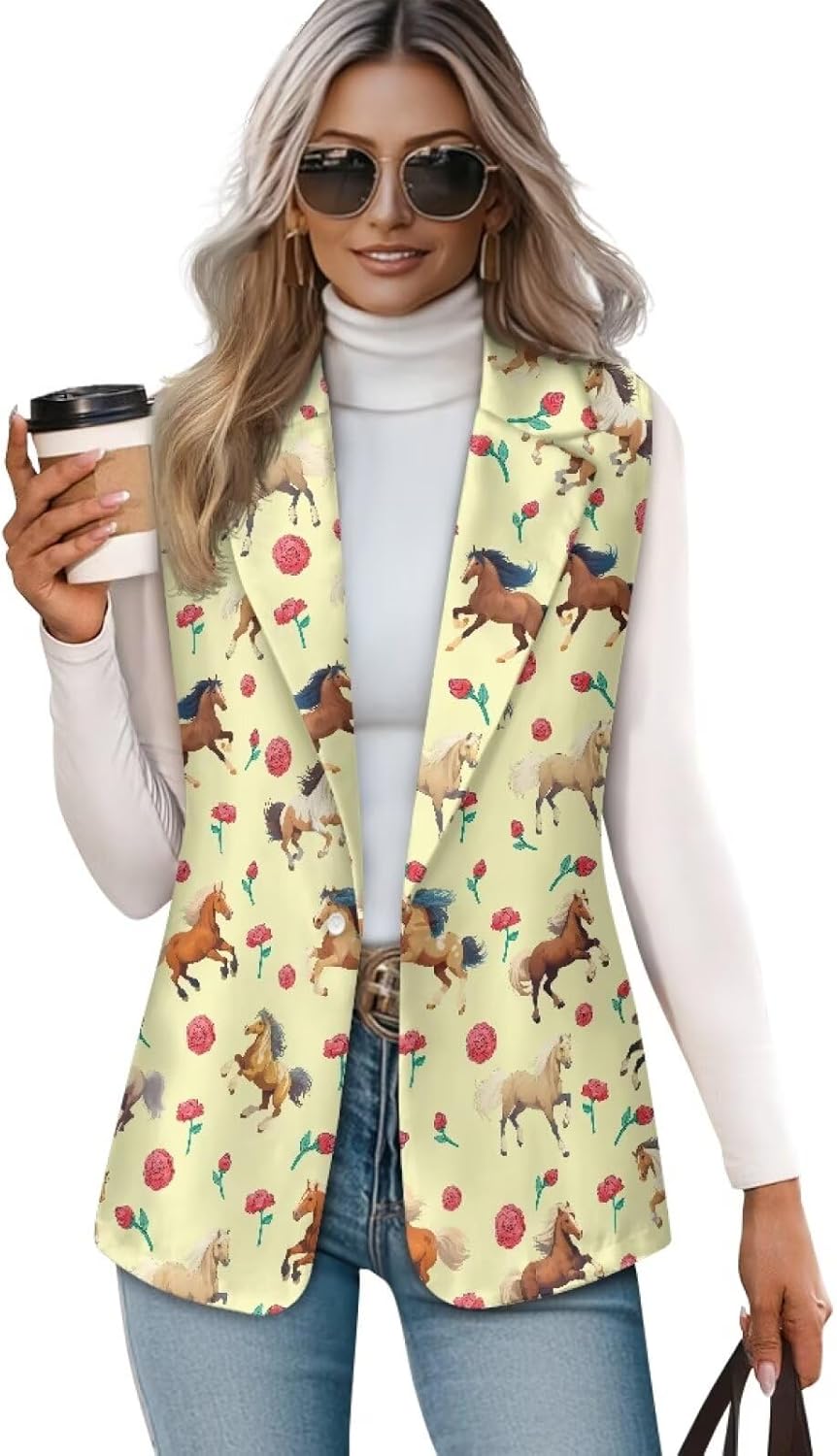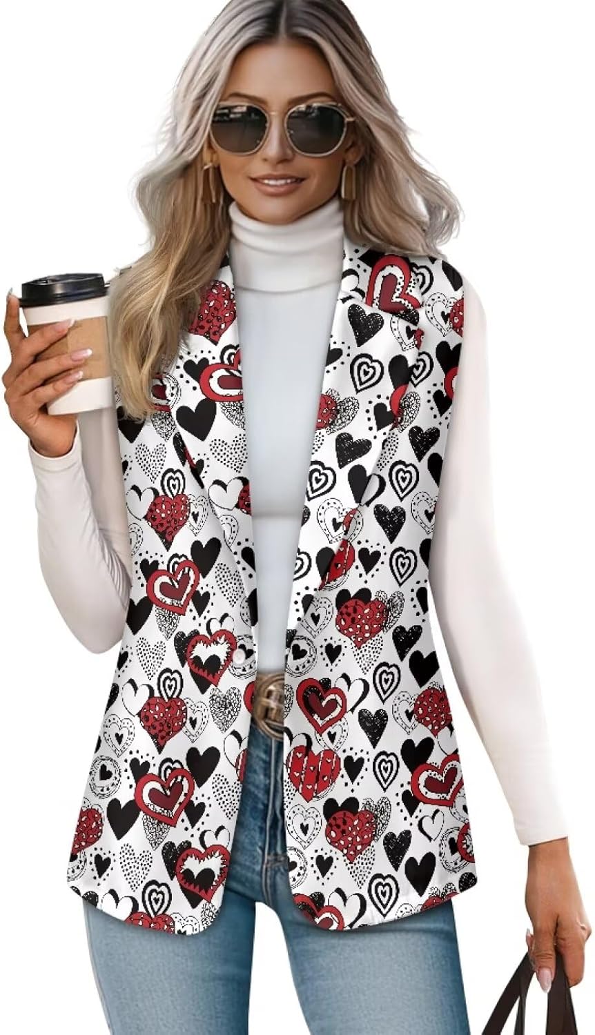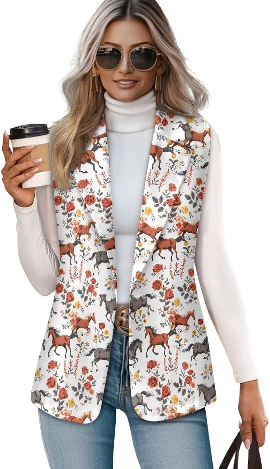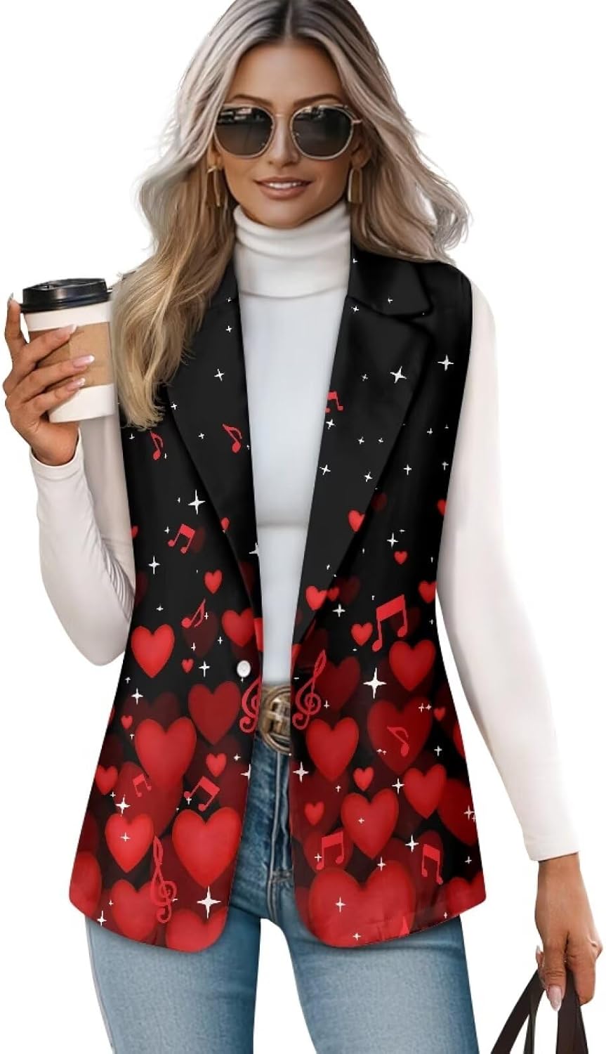 Suhoaziia Women's Sleeveless Vest Suit Waistcoat Notched Lapel Open Front Blazer Suit One Button Suit Jackets Vest Tops for Office Work Daily Production Information Material: Polyester Features: One Button, Open Front, Sleeveless Pattern: Stylish print brings you a new experience, we have a variety of patterns for you to choose from, such as chicken rooster, musical notes, hippie flowers, sunflower, dog paws, strawberry, bats, maple leaf, Christmas snowman and so on. If you want something different, try our casual vest tops! Multi-functional: The casual knit blazer suitable for casual, work, office, business, meeting, formal, school, date, event, party, club, trip, travel, photograph, graduation, etc. Easily pair it with jeans, skirts, dresses and more. Easy to care, suitable for all seasons.