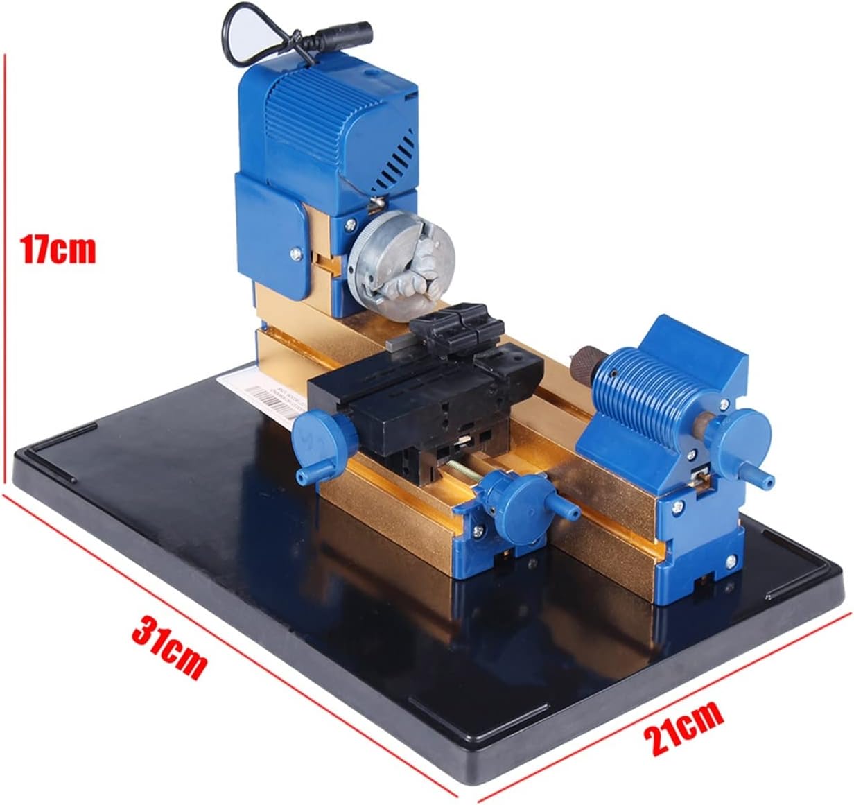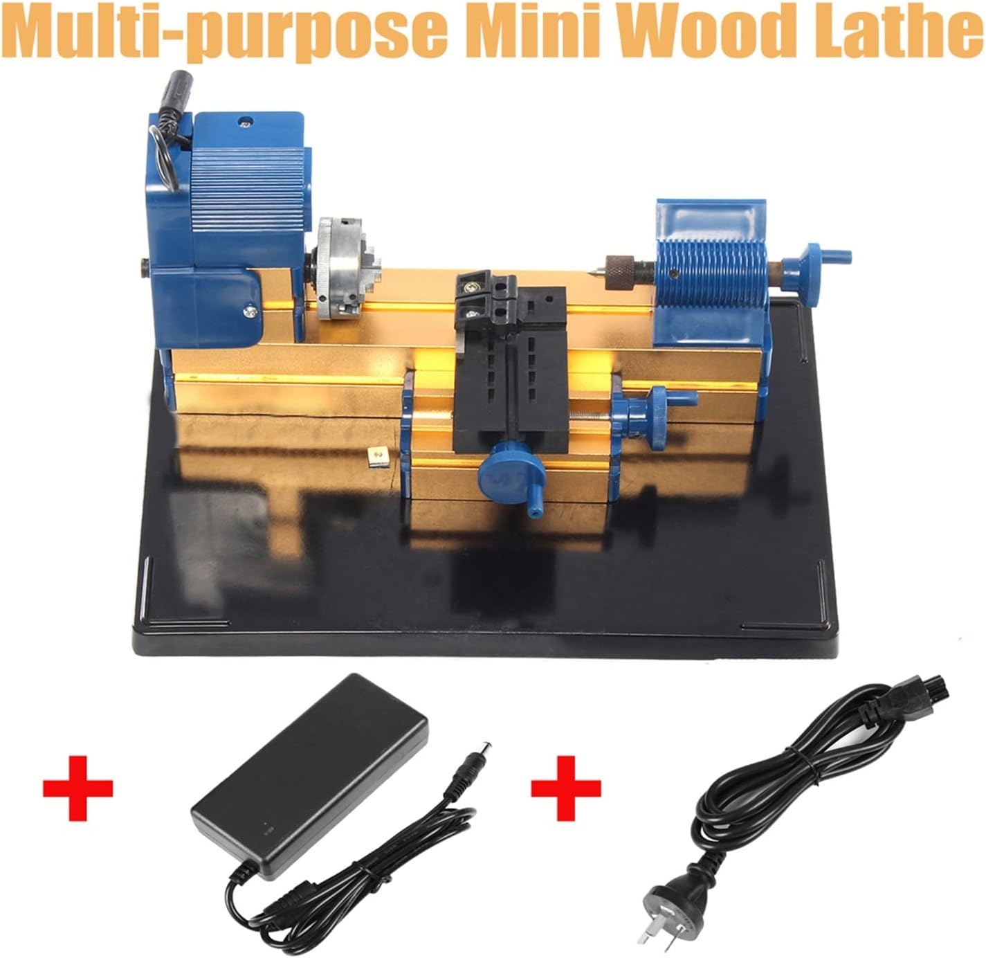 Name: Multi-purpose Mini Wood Lathe Model: 825934. Specifications: Material: Aluminum, ABS Color: Blue & GoldenInputDC12V2APower: 24W Speed: 2,000rpm/min Clamping range: 25-35 mm. Slider stroke: 30-50 mm. Application: Can process wood, engineering plastics, soft metals (aluminum, copper, etc.) Warning: ·Handle these with caution to injury ·The workpiece may fly out of the chuck when being machined ·Always make sure that the tool and workpiece are each properly secured. ·Use protection goggles when operating ·Never touc h the revolving workpiece with any part of your body. ·Keep hair and clothing well away from moving parts. ·Propulsion is furnished by a 12V direct-current motor. · Keep working place clean and tidy, make sure the assembly of machine part is done correctly. Never connect the transformer output in parallel with other transformers! If lead, plug or case of the transformer is damaged, discontinuous using the transformer immediately! Package includes: 1 x Multi-purpose mini wood lathe