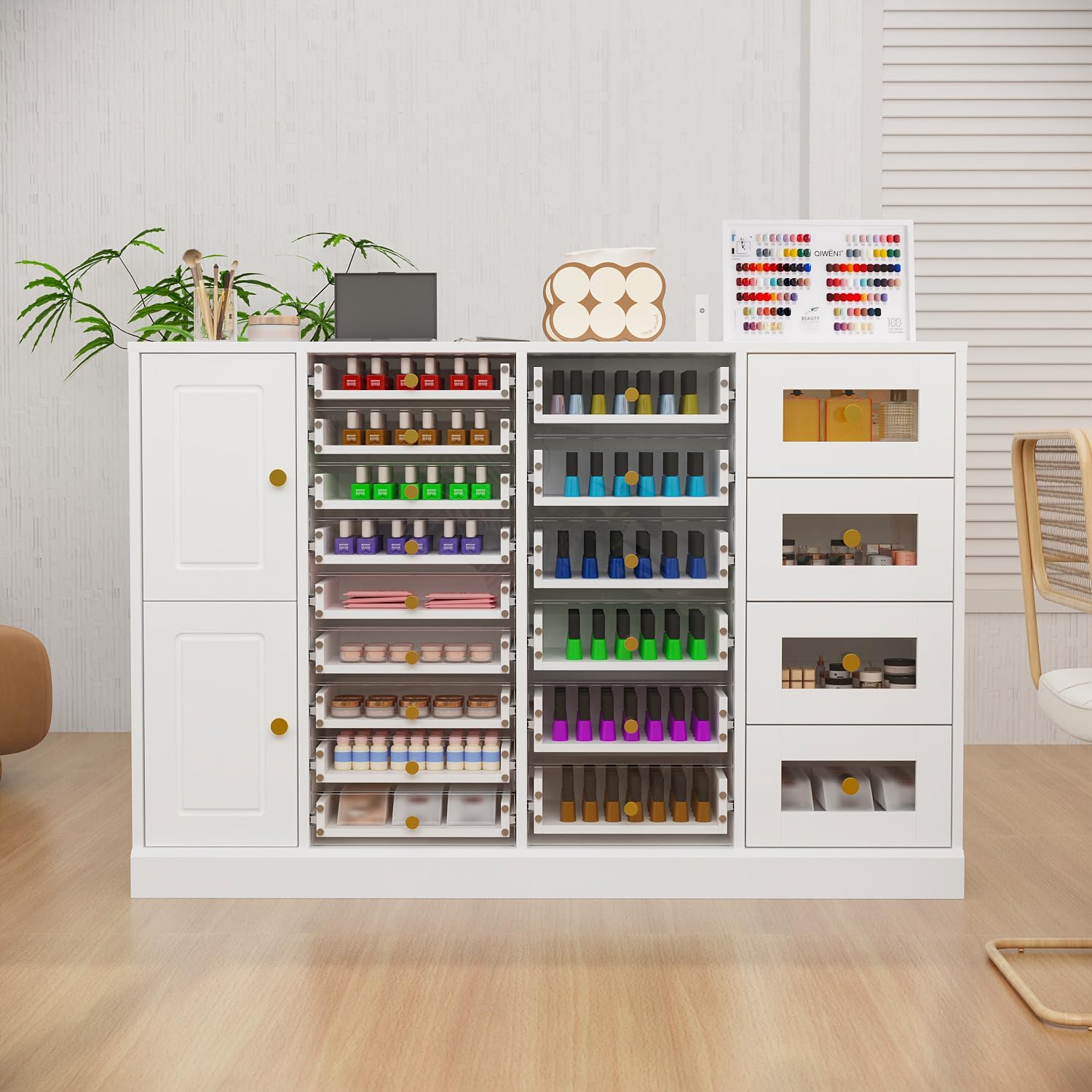 This manicure cabinet has 2 storage compartments and 19 transparent drawers for storing and displaying various nail polishes, makeup tools, and skincare items. 19 transparent drawers allow you to categorize and store nail polishes of different colors and series, creating a beautiful manicure work area. Manicure storage cabinet: 12.4"D x 47.2"W x 31.5"H. Engineered Wood & Acrylic. Modern. White