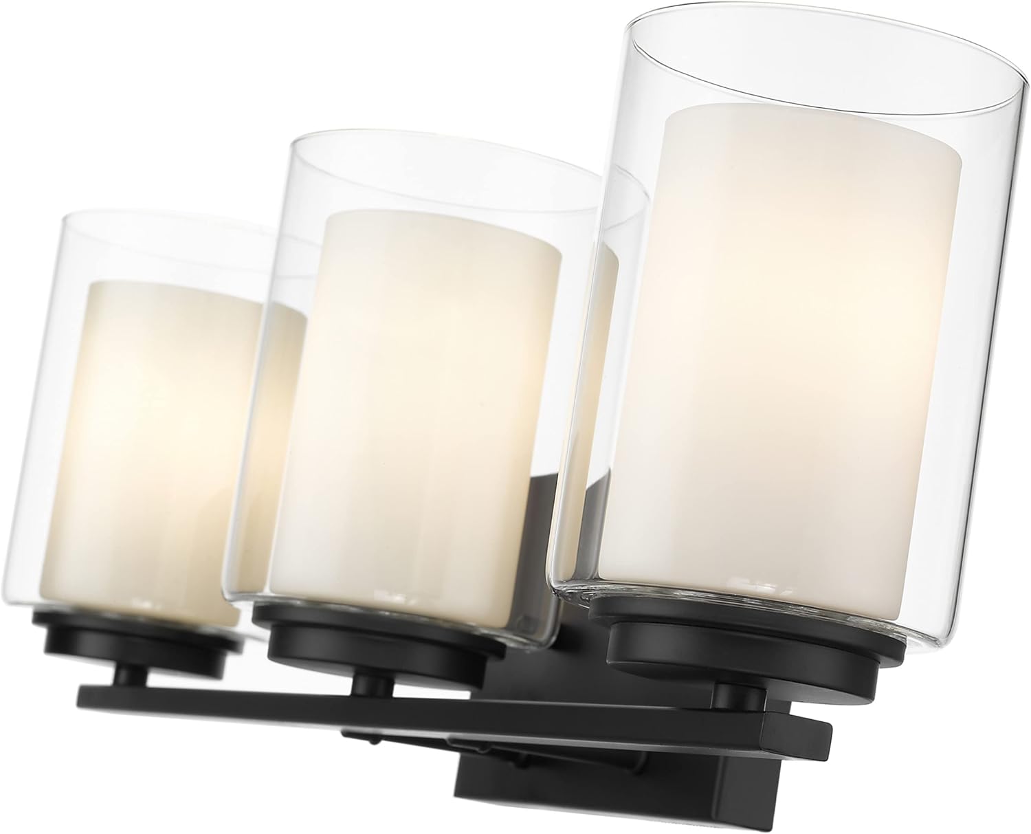 Give your powder room a chic, sophisticated update. This beautiful, matte black vanity light features three glowing bulbs beneath three delicate, glass shades that are white on the inside and clear on the outside. An exquisite lighting option to highlight your refined sense of style.