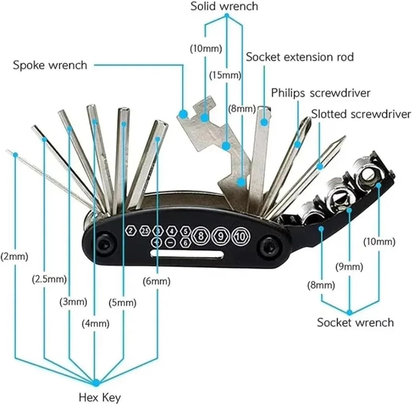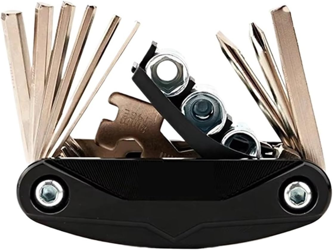 This toolbox includes 16 different tools, easy to carry. It can be used Compatible with tightening and loosening bolts and nuts, Compatible with modifications or repairs. This tool set is a valuable addition to your toolkit, a versatile and practical choice Compatible with anyone.High-quality MaterialThe Tool Repair Screwdriver Set is made of stainless steel and high quality aluminum . It is durable, solid and not easy to fade.Package Include1 x Multi Functional BicycleTool2mm ,2.5mm ,3mm ,4mm ,5mm ,6mm Allen wrench each one;8mm ,9mm ,10mm Socket wrench each one;8mm,10mm and 15mm Flat Wrenches each one;Straight and Cross screwdrive;14G Spokes tool;One extension rod.Origin : Mainland ChinaItem Type : Motorcycle AccessoriesMaterial : Stainless steel,aluminum,Steel1 : Compatible with all motorcycles2 : Compatible with Z 900 650 Z 800 Z 400 Z 1000 Z 500 Z 7503 :Compatible with 650 1000 500 400 zx-6r zx-10r zx-4rr 300 250