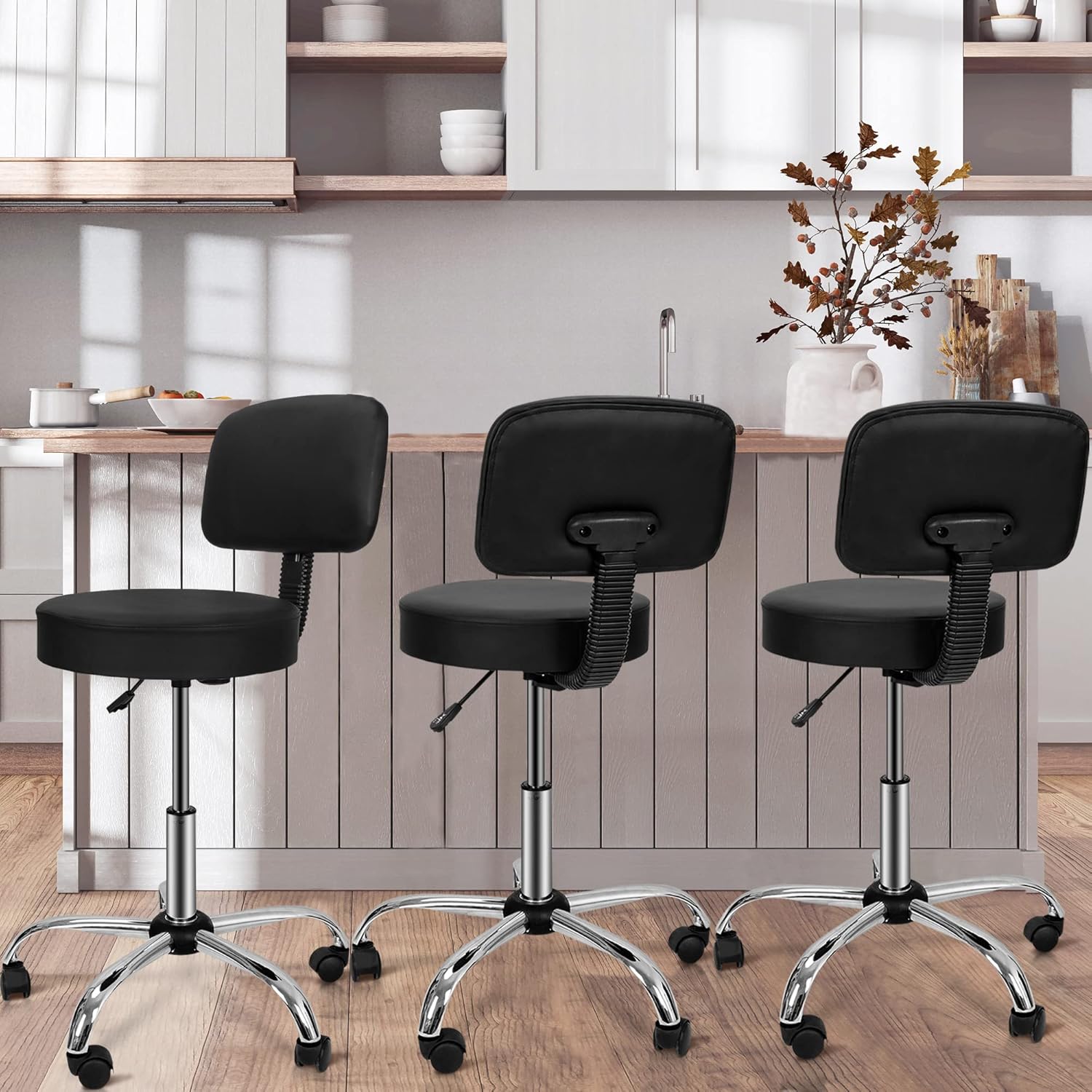 🏠Features: - Constructed by heavy duty steel base and rolling legs, high quality hydraulic lift to ensure the stool is durable and steady - High quality PU fabric surface is easy for maintenance and cleaning - Seat and back cushion is fully padded by soft sponge, ensures you are comfortable when sitting on it - Fully adjustable the seat height with approximately 6” vertical height range from 20.86”-27.55” - Full 360 degree swivel and dual wheel casters allow for easy and smooth movement - Chrome finished base and gas lift makes the stool looks fantastic and easy to clean - Ergonomic designed backrest emulates the natural shape of the spine, better support your legs and spine - Designed to increase comfort and relieve your joint and muscle pressure and fatigue brought by sedentary work - Up to 250 LBS weight capacity can meet most of your needs - Ideal for home, tattoo shops, massage parlors, studios, clinics, salons, offices, beauticians, architects and more 🏠Specifications: - Color: Black - Materials: PU + Sponge + Steel - Weight Capacity: Up to 250 LBS - Height Adjustable Range: Approx. 6” - Stool Height:32.87”-39.37” - Seat Size: Approx. 15.7” Diameter, 3.5” Thickness - Seat Height: 20.86”-27.55” - Backrest Size: 15.94” x 10.62” (L x W) - Net Weight: 14.6LBS 🏠Each Package Includes: - 1 x Rolling Stool with Back - 1 x Instruction