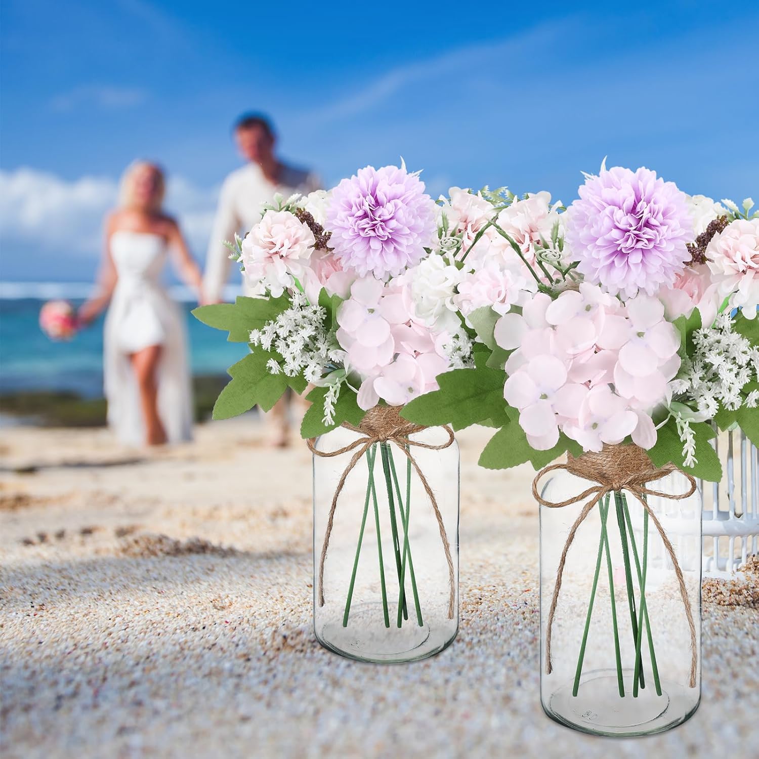 Features: Designed as clear vases for centerpieces, they shine as table centerpieces in dining rooms, banquet halls, or event venues. Their cylinder vases shape adds a touch of sophistication, effortlessly tying together your table settings and becoming the focal point of any gathering. Elevate indoor decor with stunning decorative vases! Perfect for sprucing up tables, shelves, or desks, adding a stylish touch to any room, whether your aesthetic is modern, classic or farmhouse Material: glass Color: purple Size: 6.3 x 3.15 inches Package includes: 6 vintage glass vases with hemp rope, 6 bundles of artificial hydrangeas, and 18 artificial gypsophila stems Notes: Manual measurement, please allow slight errors on size. The color may exist a slight difference due to different screen displays.