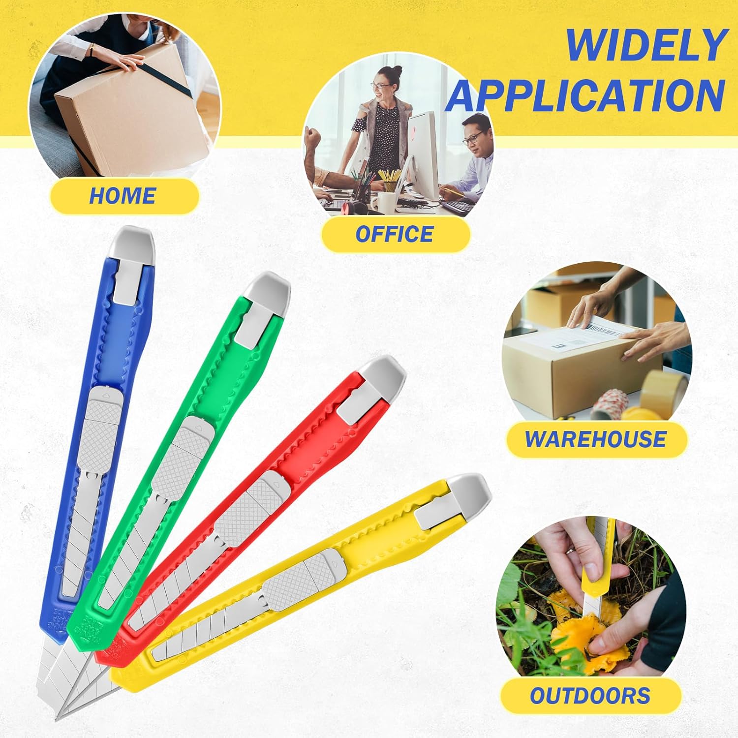 Features: The plastic package cutter is useful in your daily usage, so you can put them in your classroom, office, bedroom for convenient fetching. In this way, when you pick up the express, you can directly disassemble it. The safety box cutter for work has 4 different color, so you can share many of them for your classmates, teachers, sisters, colleagues, and more who are in need. Specifications: Material: plastic and metal Color: multicolor Size: about 0.35 inches/ 9 mm Package includes: 500 x Retractable utility knives Notes: Manual measurement, please allow slight errors on size. The color may exist a slight difference due to different screen displays. Pointed items are included, please be careful when using and please keep them away from kids