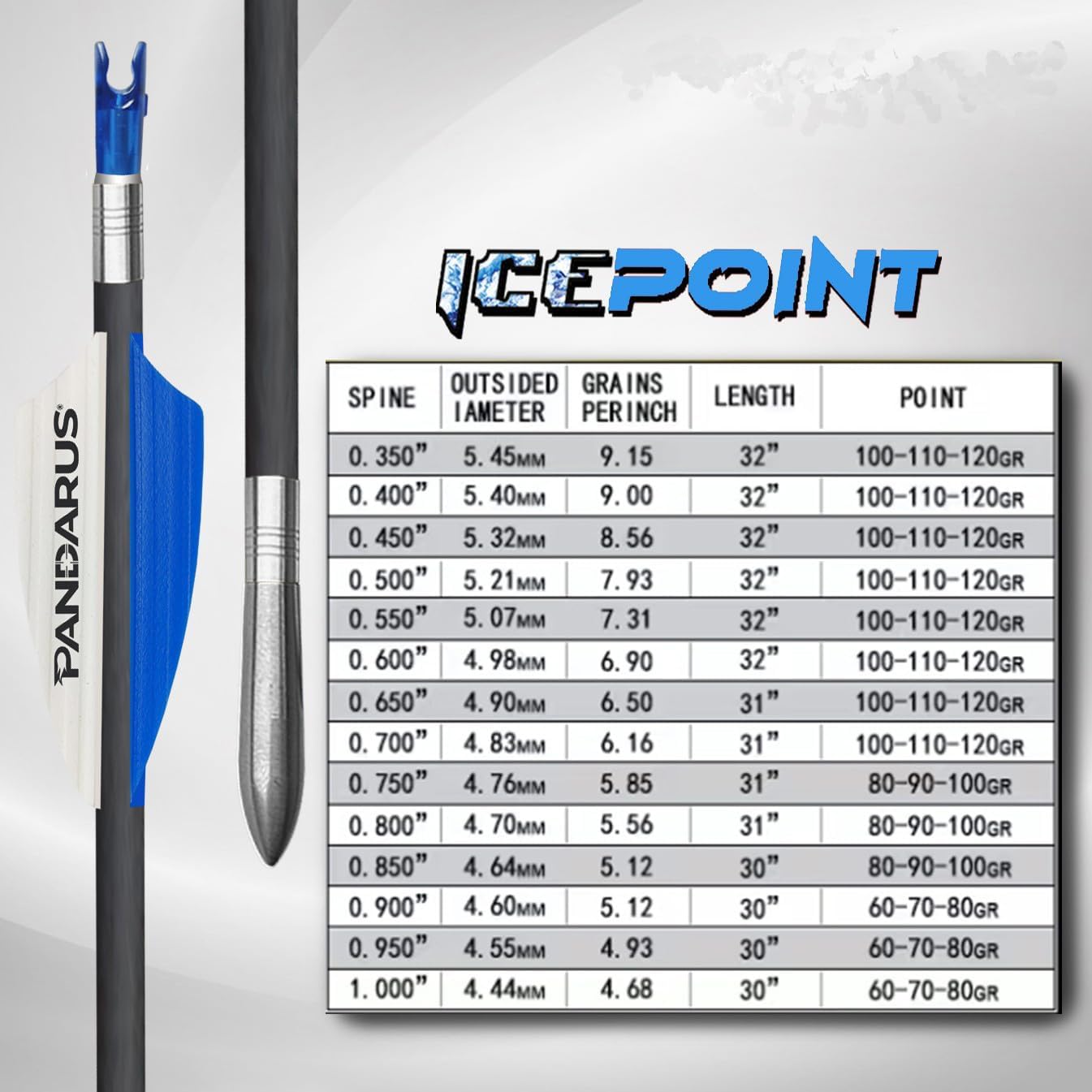 Specifications: Carbon Arrows Material: 40T Carbon Fiber Spine: 350/400/450/500/550/600/650/700/750/800/850/900/950/1000 Full Arrow Length: 33.5"/85.1cm Arrow Shaft Length: 32"/81.3cm Standard Arrow Length: 32.36"/82.2cm Straightness: +/-0.006” Shaft ID: 3.2mm(.125”) Shaft OD: different spine has different outer diameter, the Shaft OD of Spine 1300 is 4.5mm,others please refer to the listing picture Arrow Pin Size: 3.2*4.5 Arrow Tip: 100 grain Stainless Steel Weight: different spine has different weight, the net weight of spine 1300 is 18.7-19g(about 293grain, others please refer to the Listing Picture) (Has measurement errors, no guarantee that the weight of each arrow is exactly the same. ) Package Quantity: 12 pieces Carbon Arrows with 1.75” Rubber Fletched Note: 1.Do not shoot to hard objects (such as stone or concrete wall). This may damage your arrows and cause shattering or cracking. 2.Check the status of arrows before shooting. If you find cracks on one arrow shaft, please change another arrow for safety reasons. 3.Please use a proper bow within recommended draw weight range. Using a bow with too high draw weight may cause damage both to your bow and arrows. 4.This is not a toy. Do not shoot to people.